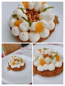 Ensuite je mets un coulis que j’ai fait à base de jus de clémentines et un peu de pralin et des petits morceaux d’ananas pour décorer.cest tout!