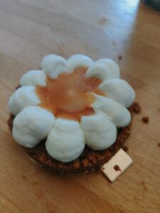 Ensuite je mets dans un emporte pièce en tassant bien et lorsque le beurre refroidit ça donne une base de tartelette sur laquelle il suffit de pocher un peu de crème montée. J’utilise de la crème à 30% de matières grasses et bien froide sinon ça monte pas. Je mets aussi un peu de gélatine dedans pour qu’elle soit bien consistante et qu’elle ne s’écroule pas.